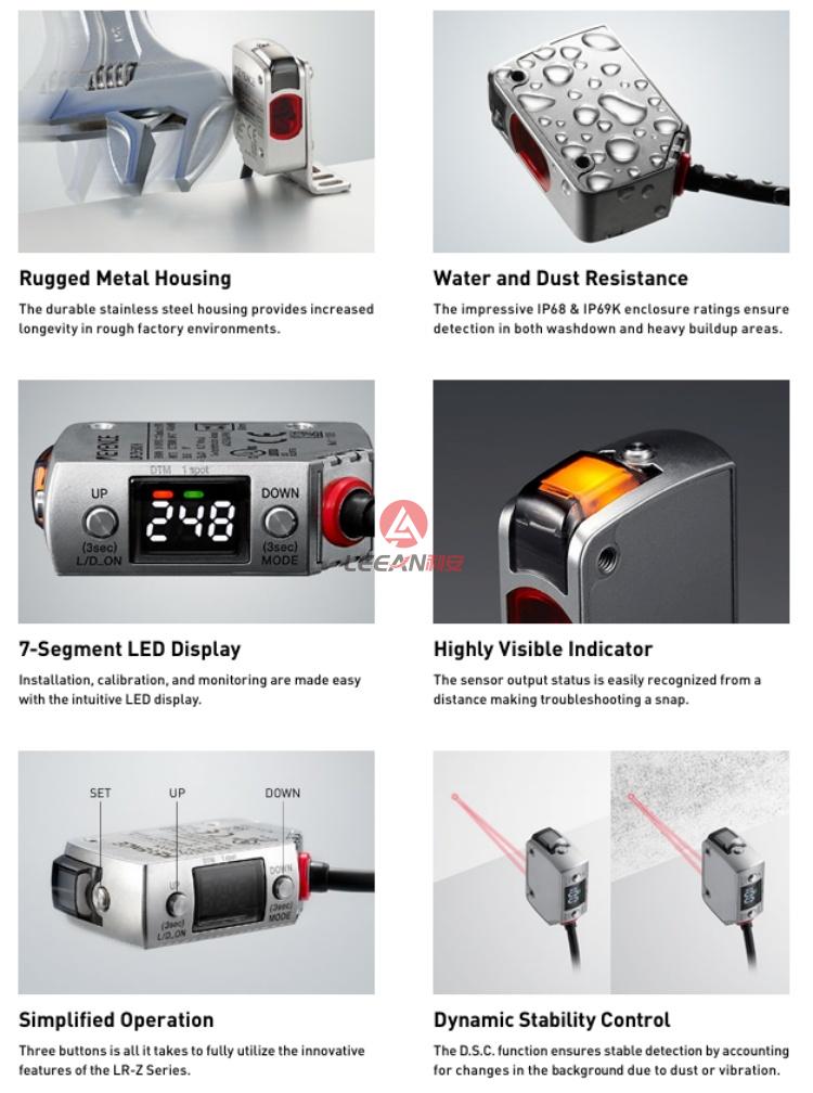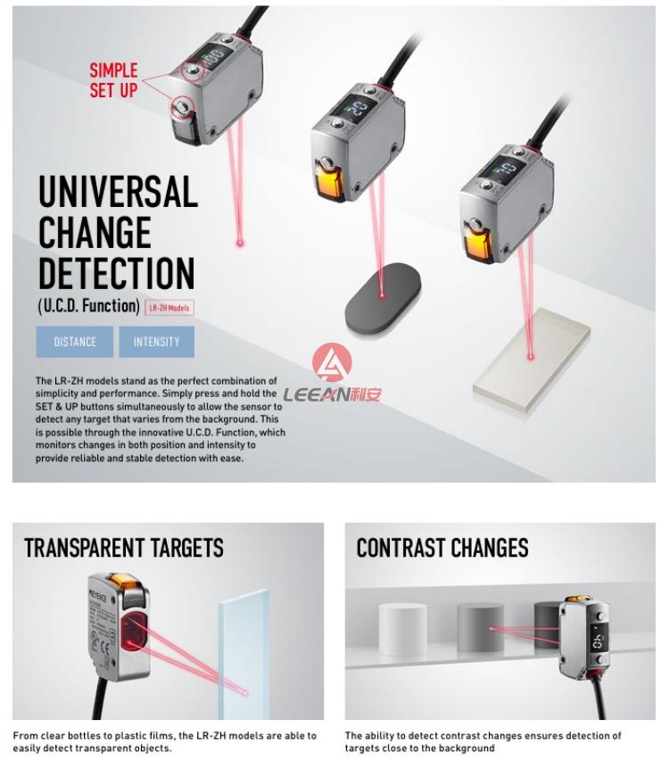 The LR-ZH models stand as the perfect combination of simplicity and performance. Simply press and hold the SET & UP buttons simultaneously to allow the sensor to detect any target that varies from the background. This is possible through the innovative U.C.D. Function, which monitors changes in both position and intensity to provide reliable and stable detection with ease.