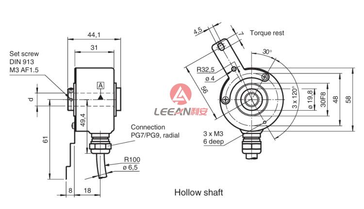 This incremental rotary encoder is available as hollow shaft design with a shaft Ø10 mm, Ø12 mm or Ø15 mm. The rotary encoder is held in place by an included torque rest.