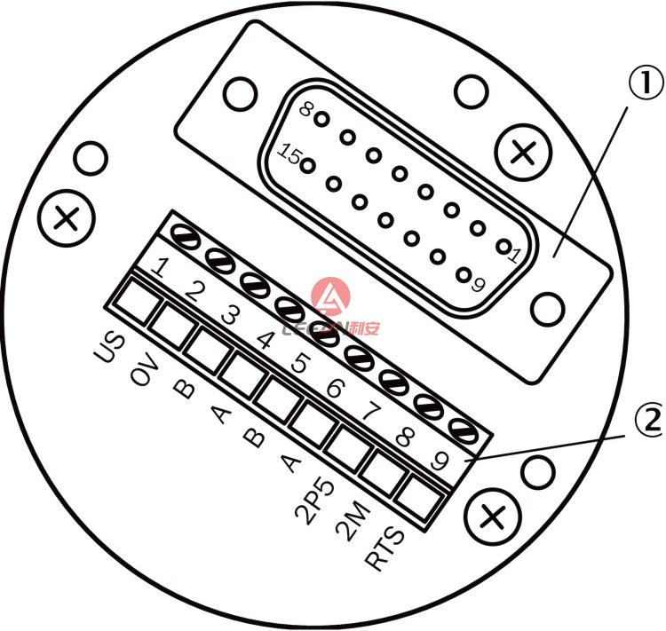 Encoders with a PROFIBUS connection adapter have screw connections (metric/PG) for connecting the bus and supply cables. The bus adapter from the complete device is screwed on to connect the cables. The adjacent figure shows the pin assignment within the bus adapter.